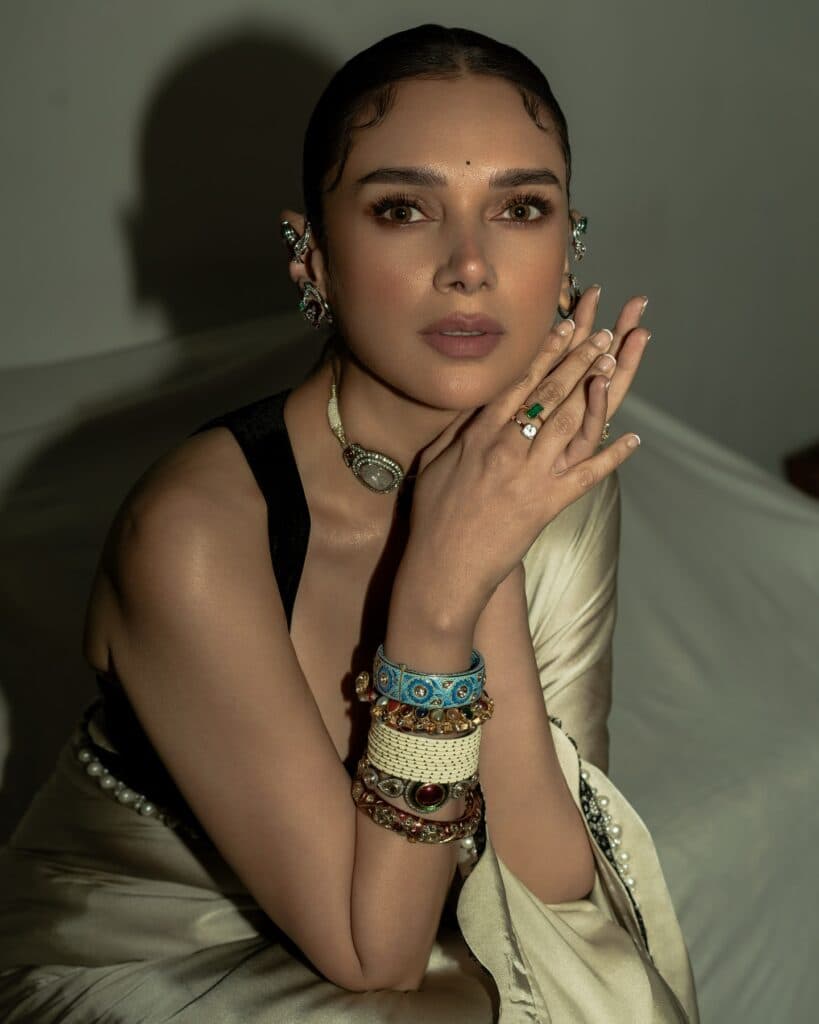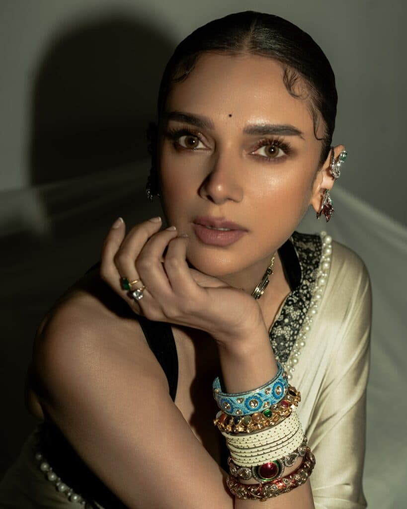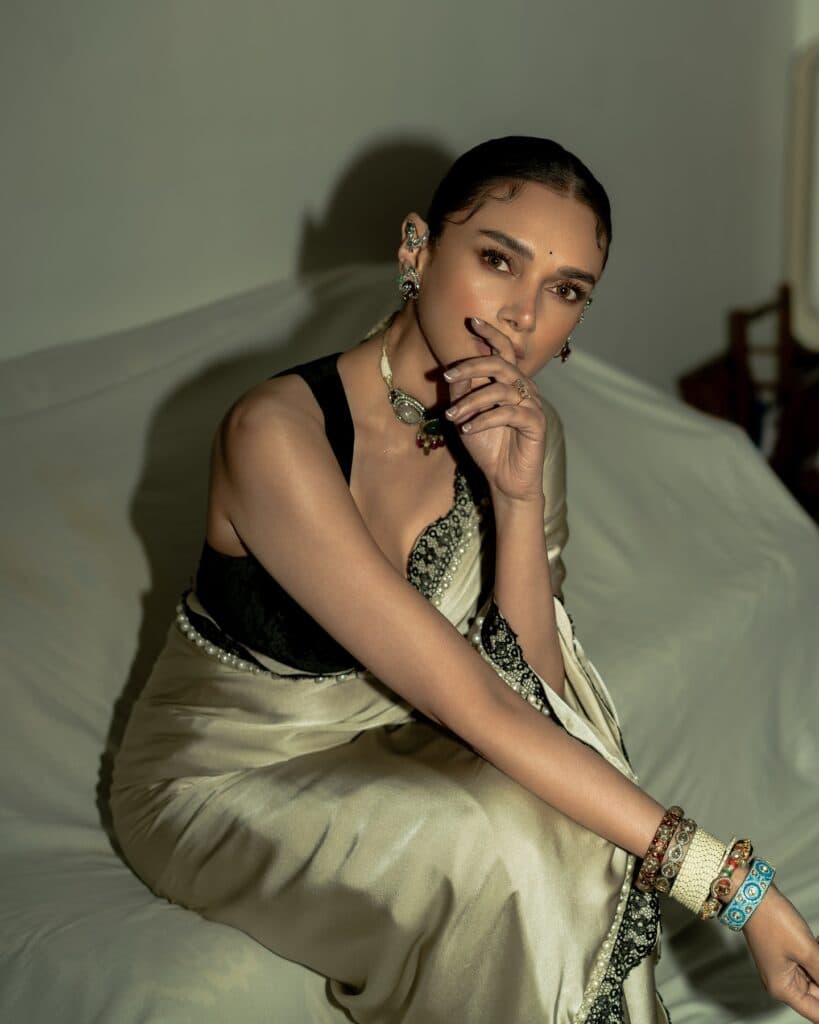 అదితి రావు హైదరికి టాలీవుడ్లో ఇప్పటివరకు నాలుగు సినిమాలే సమ్మోహనం, అంతరిక్షం 9000 KMPH, వి, మహా సముద్రం కానీ ఆమెకు ఇక్కడ మంచి అభిమాన వర్గం ఉంది. మొదటి చిత్రం సమ్మోహనం మంచి హిట్ కాగా, మిగతావి సగటుగా నడిచాయి. టాలీవుడ్తో పాటు హీరామండి వంటి OTT హిట్స్ నుంచి మ్యూజిక్ వీడియోల వరకు విభిన్న ప్రాజెక్ట్స్ చేస్తూ ఆమె కొనసాగుతోంది. ఇటీవల సూపర్వుమనియా గ్రేస్ఫుల్ వారియర్ అవార్డు పొందిన తర్వాత అదితి అందరి దృష్టిని ఆకర్షించింది. సాఫ్ట్ సిల్క్ చీర, డీప్ బ్లాక్ బ్లౌజ్, నిటారుగా కట్టిన జుట్టు, బోల్డ్ చోకర్ అన్నీ కలిసి ఆమెకు ఓ క్లాసిక్ లుక్ ఇచ్చాయి. మినిమల్ మేకప్తో అదితి తన సహజమైన గ్రేస్ను మరింత మెరిపించింది. ప్రస్తుతం ఆమె పరివారక్ మనురంజన్ అనే హిందీ చిత్రం మరియు లయనెస్ అనే ఇంగ్లీష్ సినిమాను షూట్ చేస్తోంది.