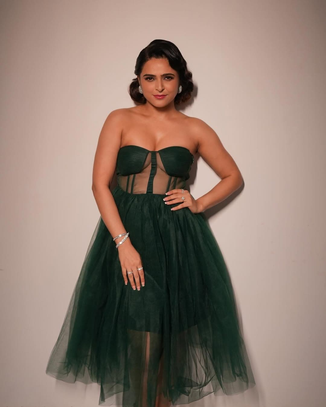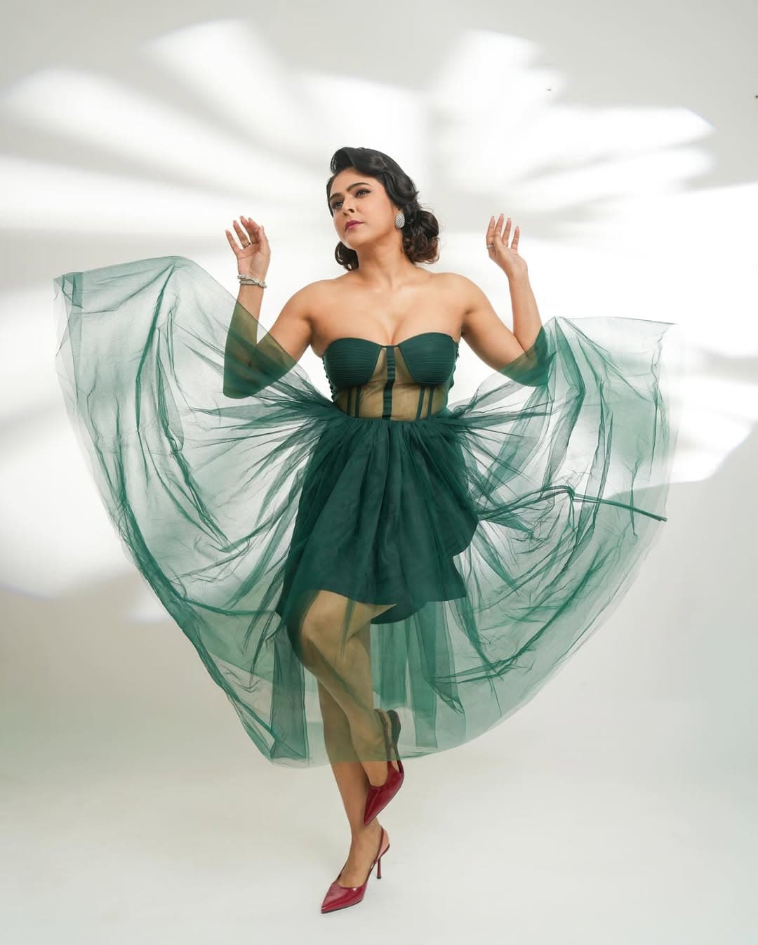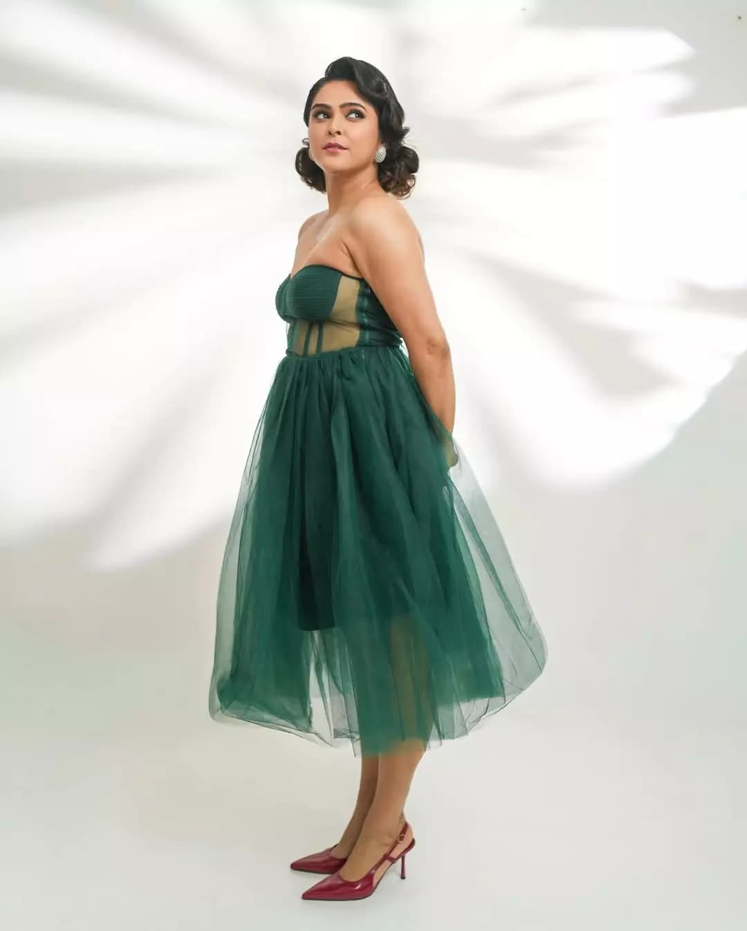 డీప్ గ్రీన్ రేట్రో డ్రెస్లో మధురిమ తులి అద్భుతంగా మెరిశారు. క్రియేటివ్ టీమ్ అందంగా రూపొందించిన ఈ లుక్కు ఆమె “Retro vibes” అని క్యాప్షన్ ఇచ్చారు.