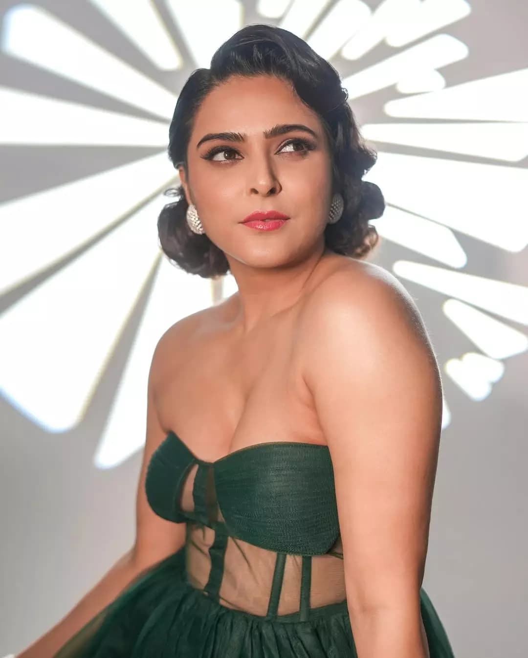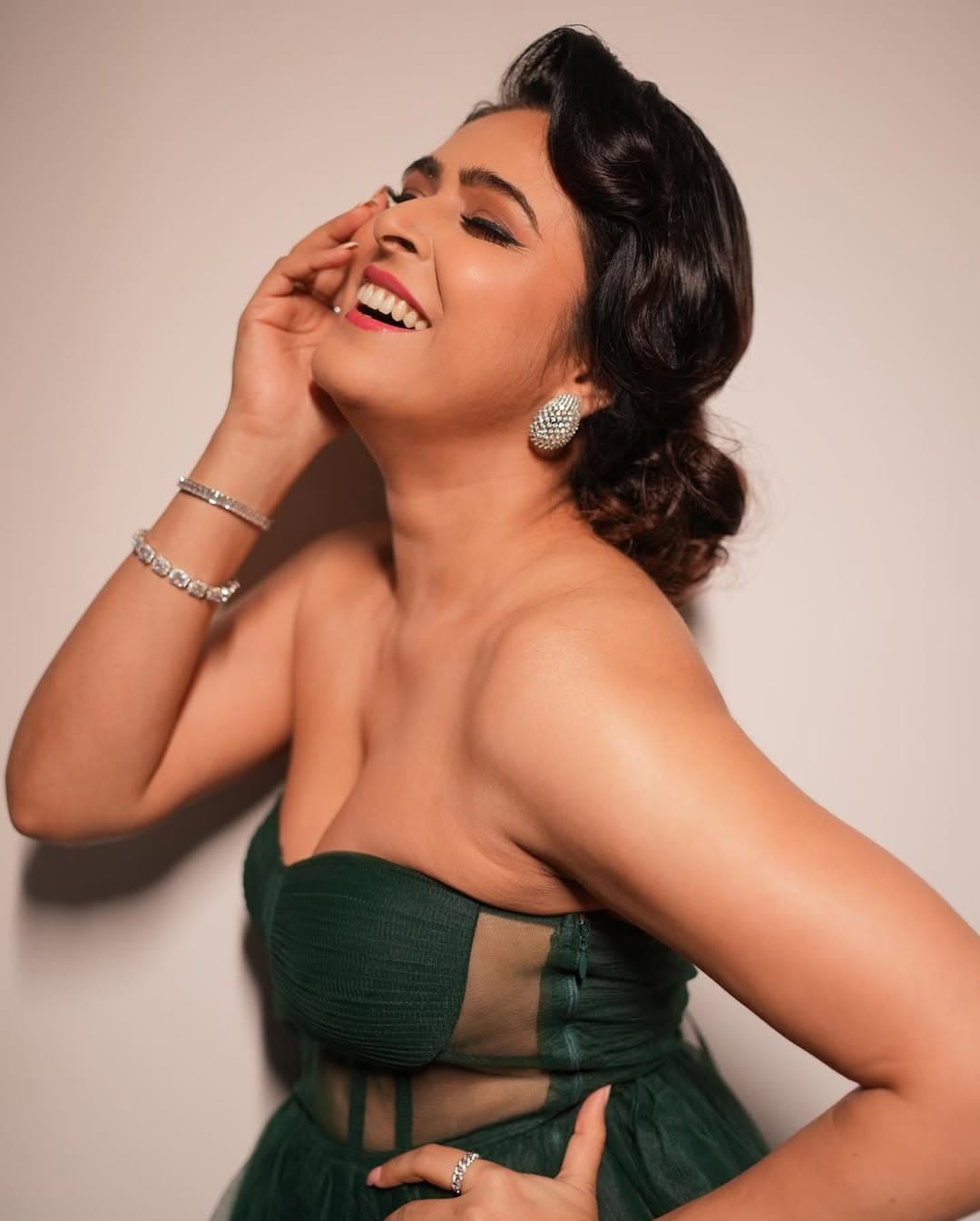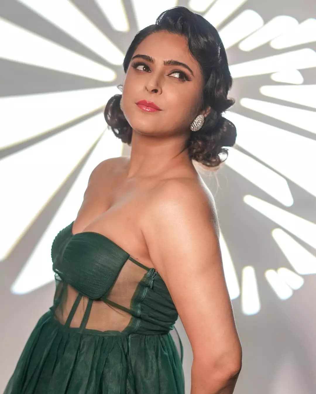 డీప్ గ్రీన్ రేట్రో డ్రెస్లో మధురిమ తులి అద్భుతంగా మెరిశారు. క్రియేటివ్ టీమ్ అందంగా రూపొందించిన ఈ లుక్కు ఆమె “Retro vibes” అని క్యాప్షన్ ఇచ్చారు.