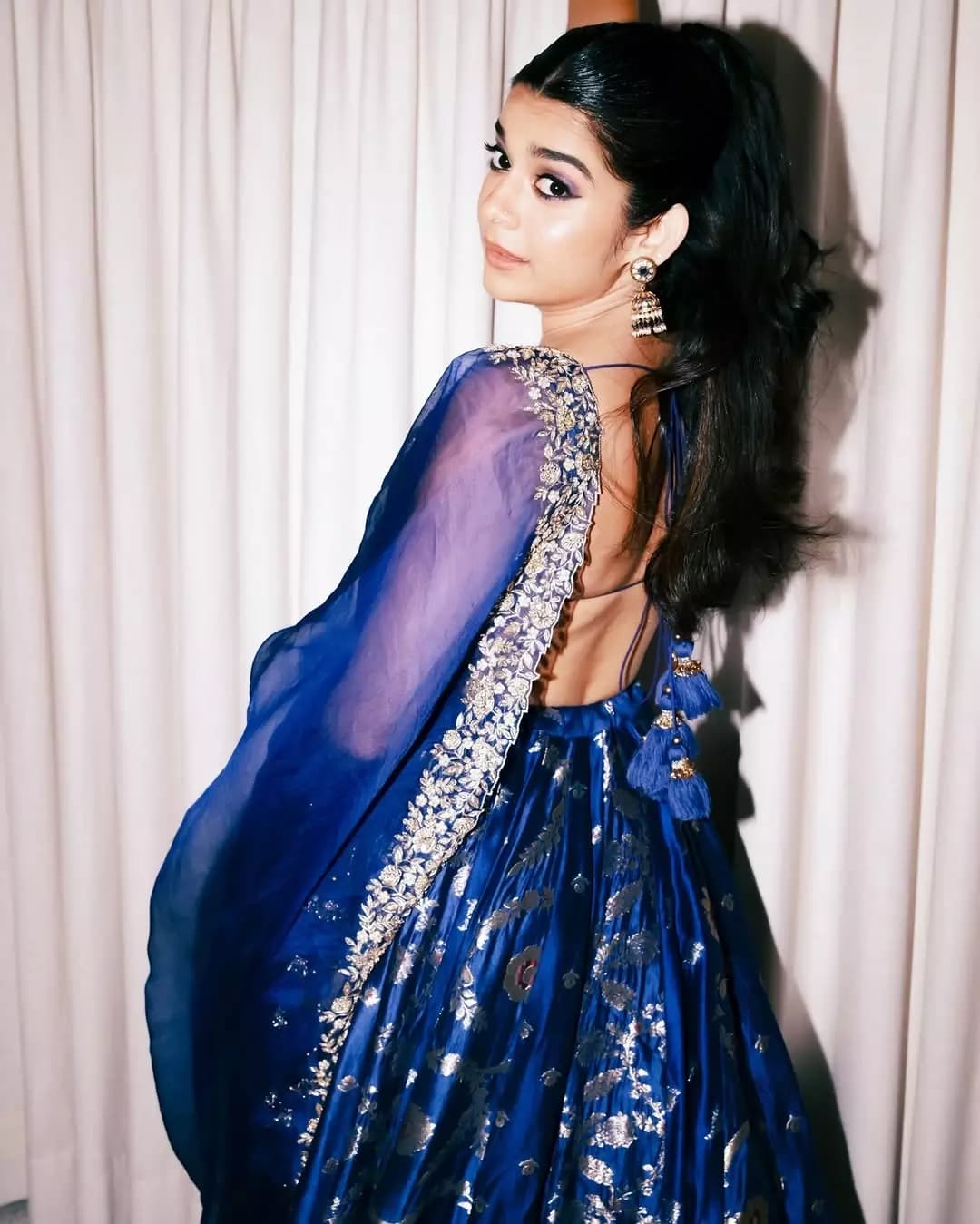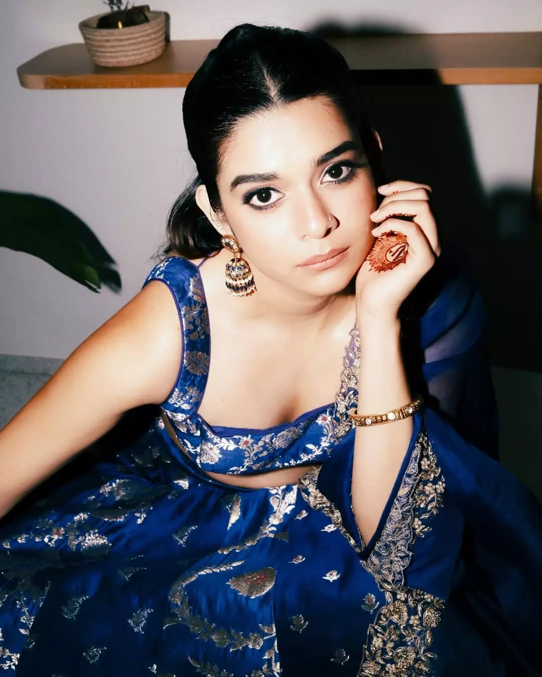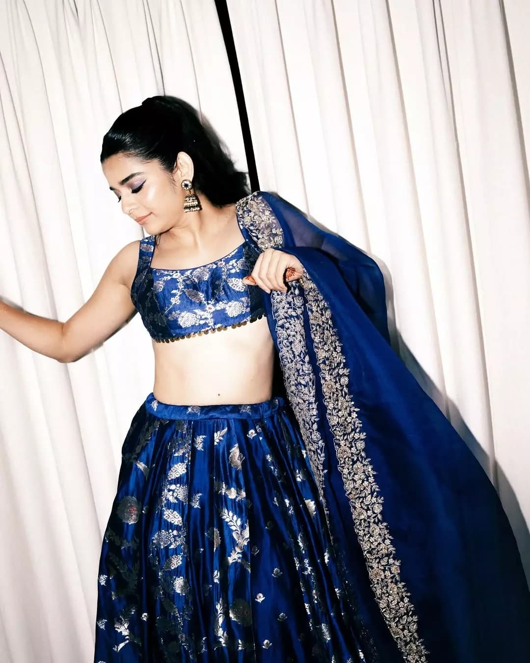 రాయల్ బ్లూ రంగు లెహెంగాలో మిథిలా పాల్కర్ అద్భుతమైన గ్రేస్ను ఆవిష్కరిస్తోంది. సిల్వర్ ఎంబ్రాయిడరీ, కాయిన్ డిజైన్ బ్లౌజ్, సంప్రదాయ ఆభరణాలతో ఆమె లుక్ మరింత ఆకట్టుకునేలా మారింది.