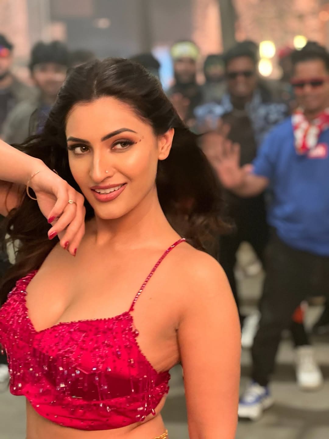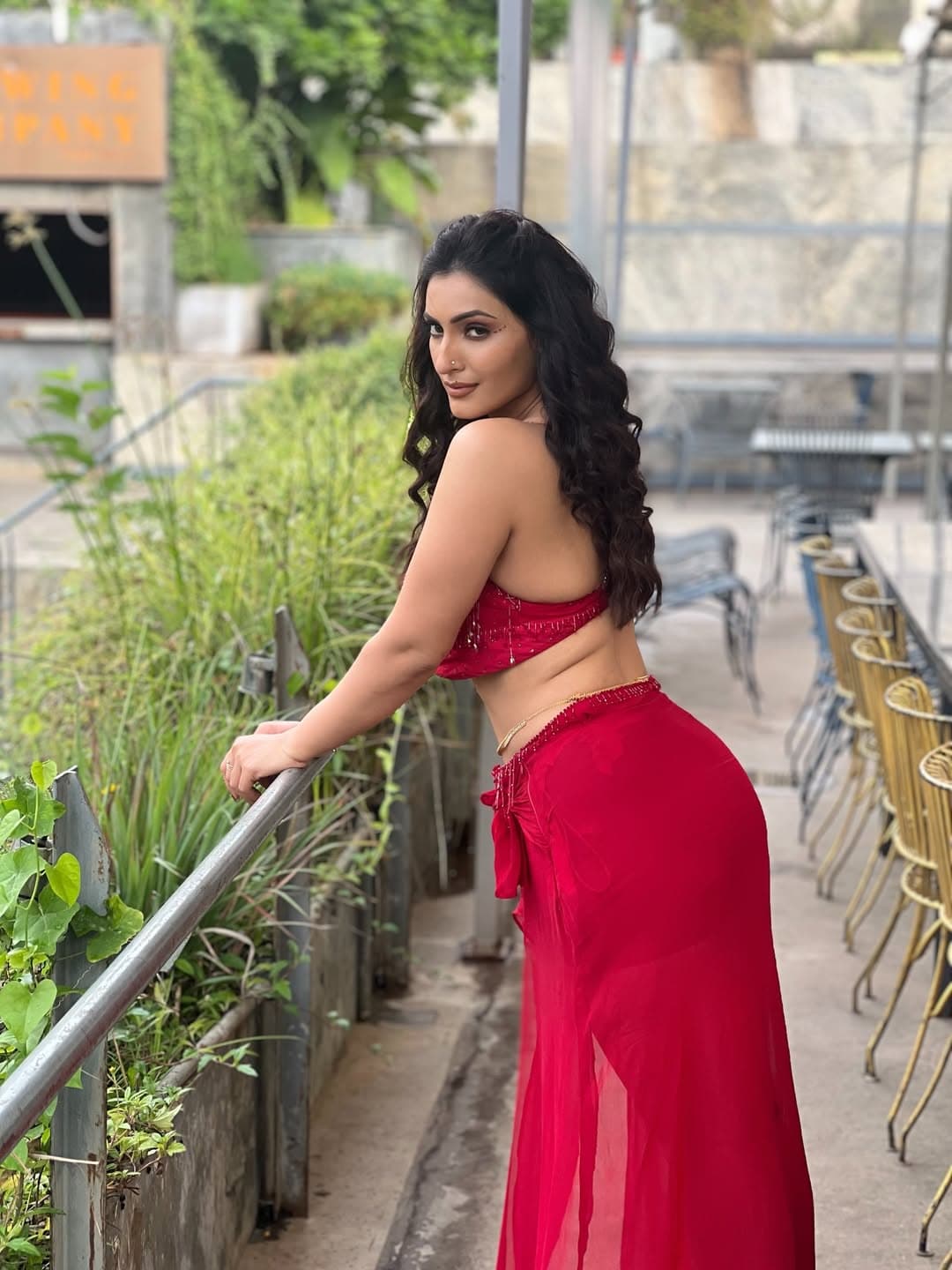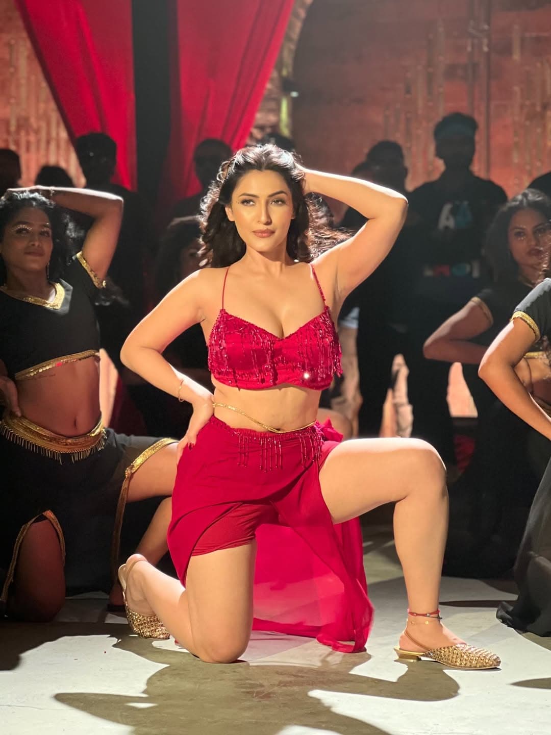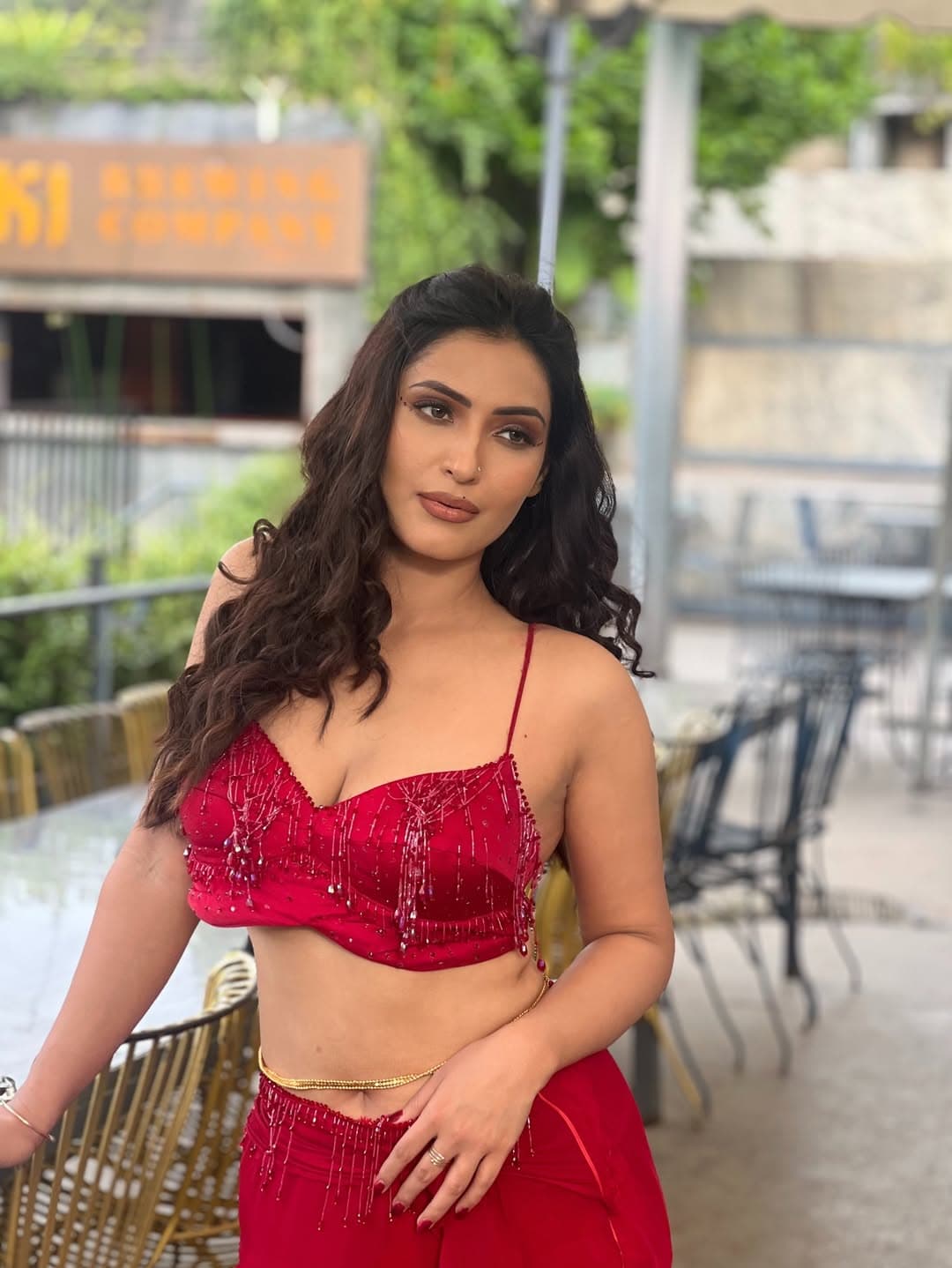 టెరర్ సాంగ్లో శివంగి వర్మ తన స్టైలిష్ రెడ్ లుక్తో సోషల్ మీడియాలో ట్రెండ్ అవుతోంది. షిమ్మరింగ్ సీక్విన్ బ్రాలెట్, ఫ్లోయింగ్ డ్రేప్డ్ స్కర్ట్, గోల్డెన్ వెస్ట్ చైన్తో ఆమె లుక్ పూర్తిగా గ్లామ్ వైబ్ ఇస్తోంది. స్పార్క్లింగ్ హీల్స్తో స్టైలింగ్ను కంప్లీట్ చేసి, మోడ్రన్ ఫ్యాషన్ స్టేట్మెంట్గా నిలిచింది.
