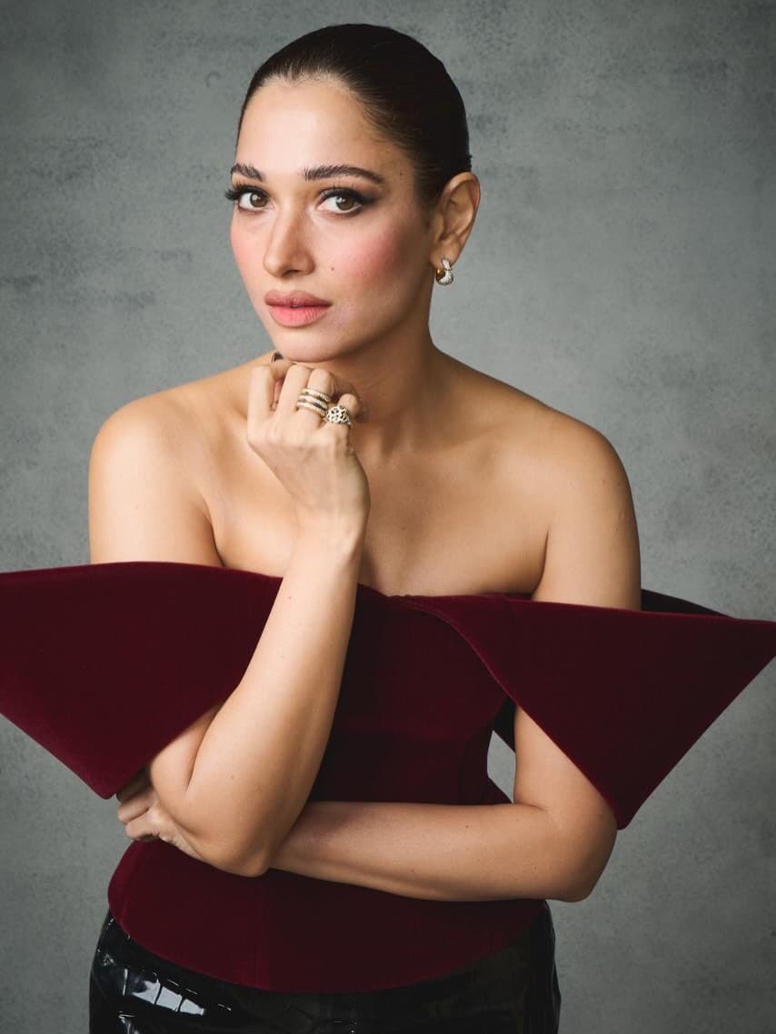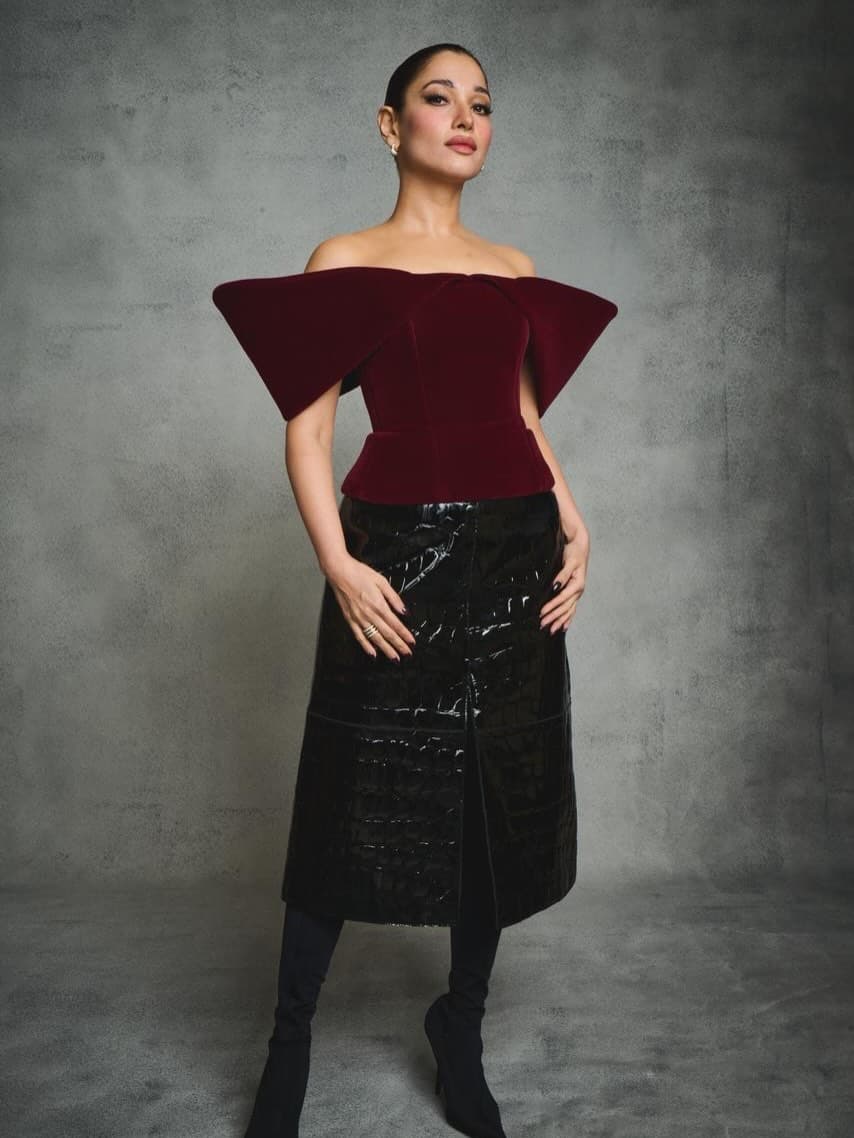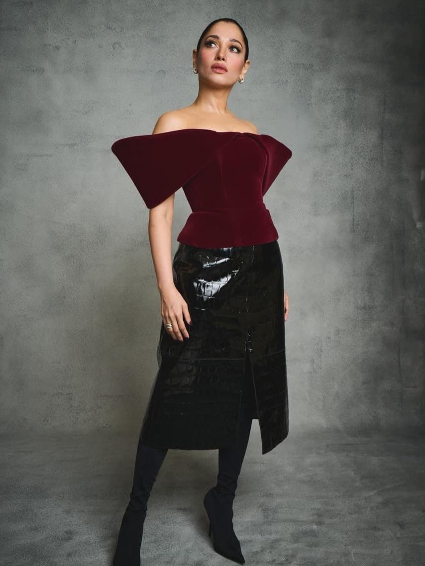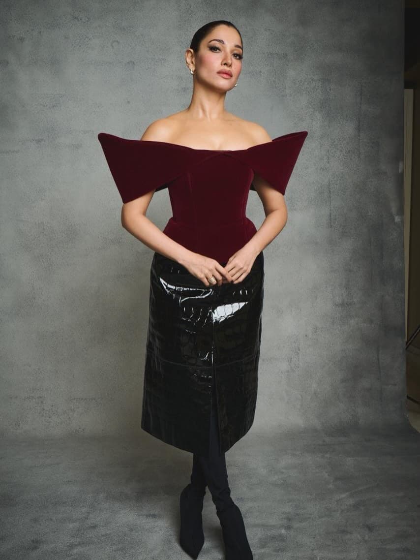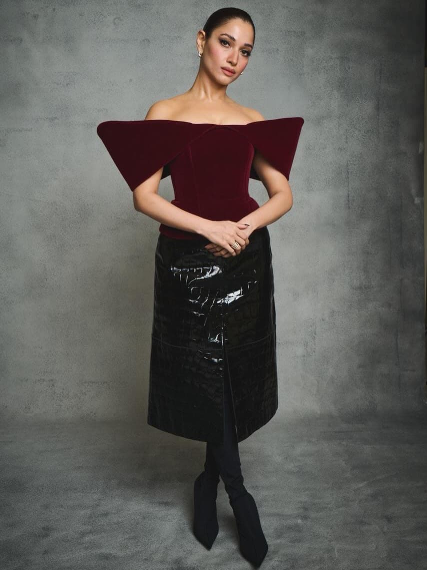మరూన్, బ్లాక్ కాంబినేషన్లో తమన్నా ధైర్యంగా, ఎలిగెంట్గా మెరిసింది. ఆమె స్టైల్, కాన్ఫిడెన్స్ ఈ లుక్ను ప్రత్యేకంగా నిలబెట్టాయి.